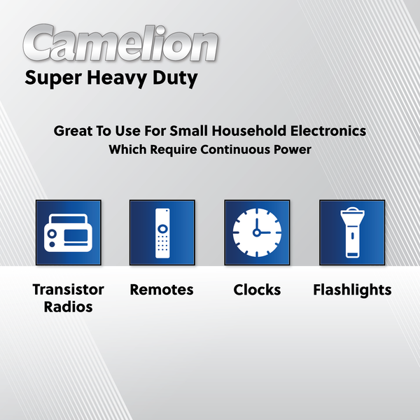 Camelion Zinc Carbon Batteries are perfect solutions for small household electronic devices that require continuous power supply such as clocks, flashlights, remote controls and transistor radios. Raw materials such as manganese dioxide and zinc/ammonium chloride are consumed to provide the battery a leakage proof structure. This type of battery offers a long shelf life as well as reliability, versatility and savings.