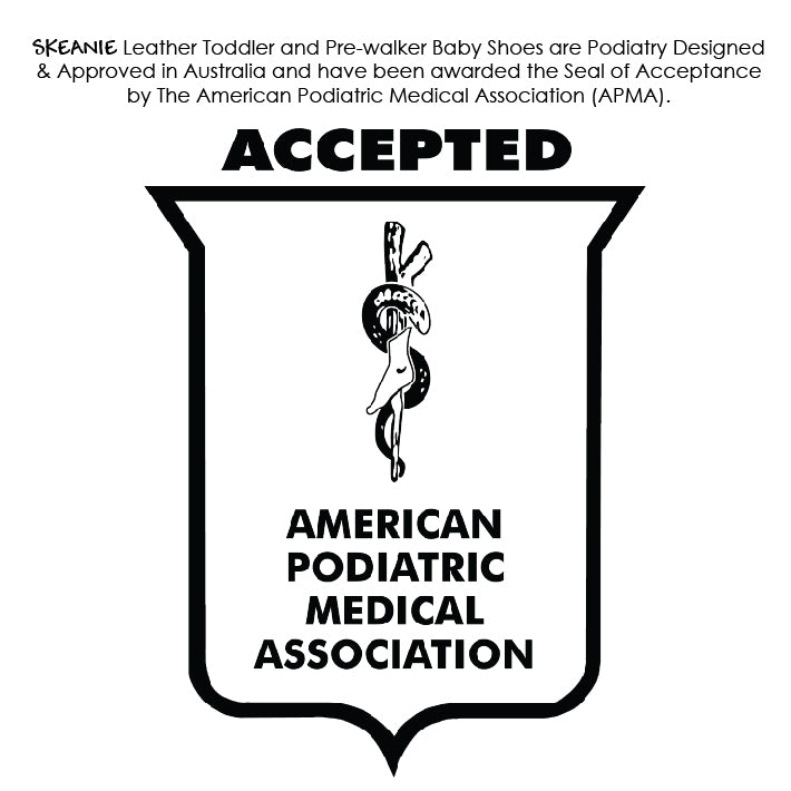 Our pre walker shoes have been awarded the Seal of Acceptance by The American Podiatric Medical Association (APMA). All SKEANIE Shoes are designed in Australia and are Fair Trade Made. SKEANIE pre walker shoes are Podiatry Designed and Approved. Colours may vary slightly.