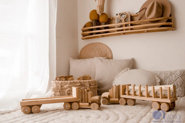 Among the series of handcrafted wooden trucks is this gorgeous log truck. This truck features a detachable head and a trailer full of logs. The truck is finished with natural vegetable oil, with minimal chemicals involved. All Qtoys are made of plantation timber using non toxic materials.