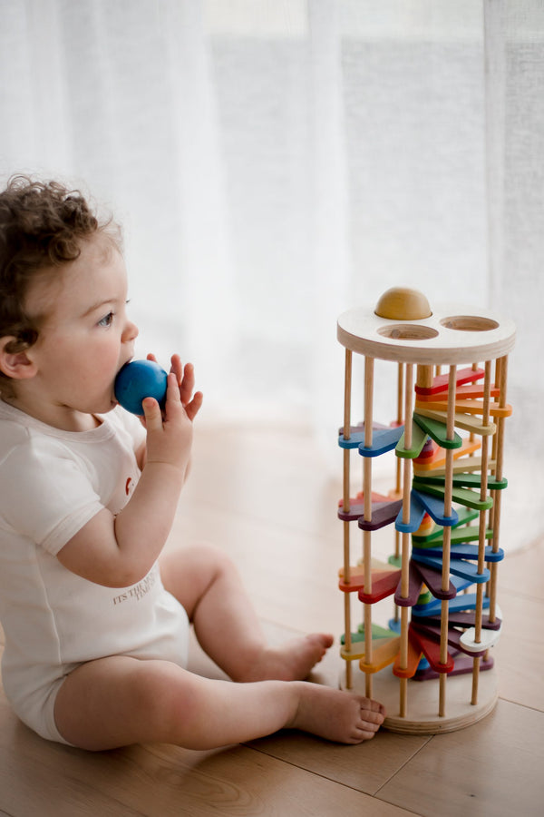 pound the balls from the top and enjoy watching the colorful balls rolling through the rainbow track! This is a great toy for eye tracking and motor skills. All Qtoys are made of plantation timber using non-toxic materials.